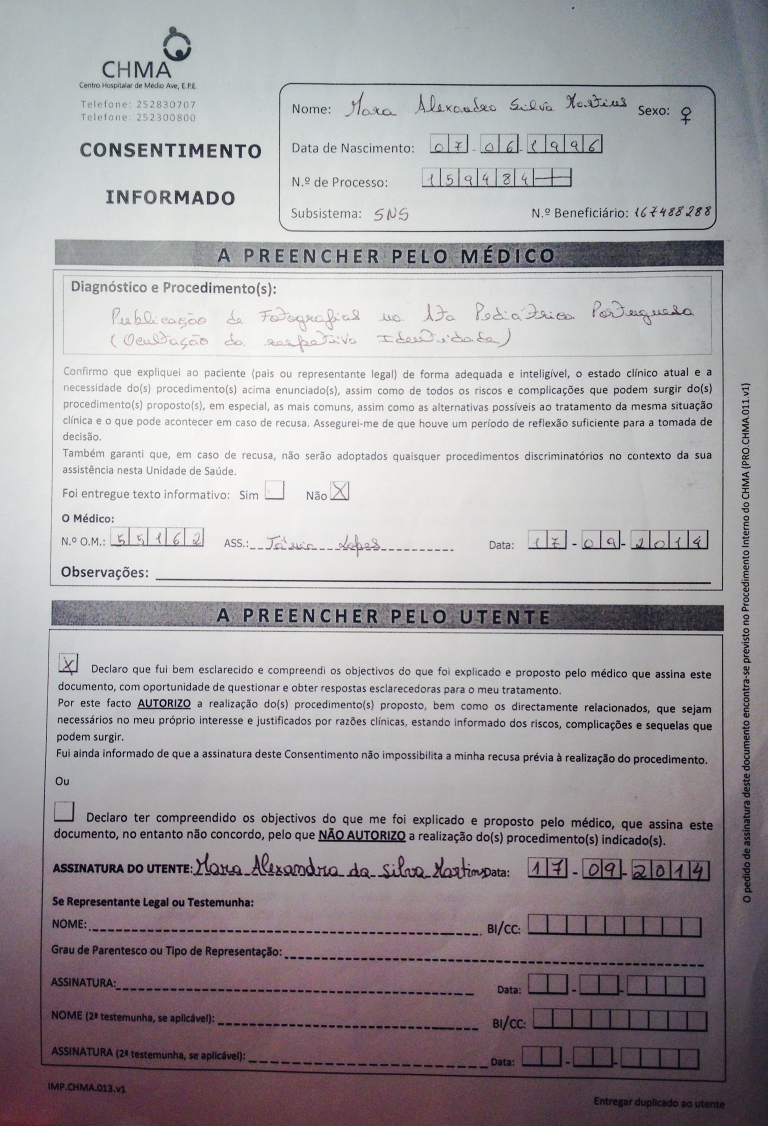 - autorização para publicação de fotografias por parte do doente (Português (Portugal))